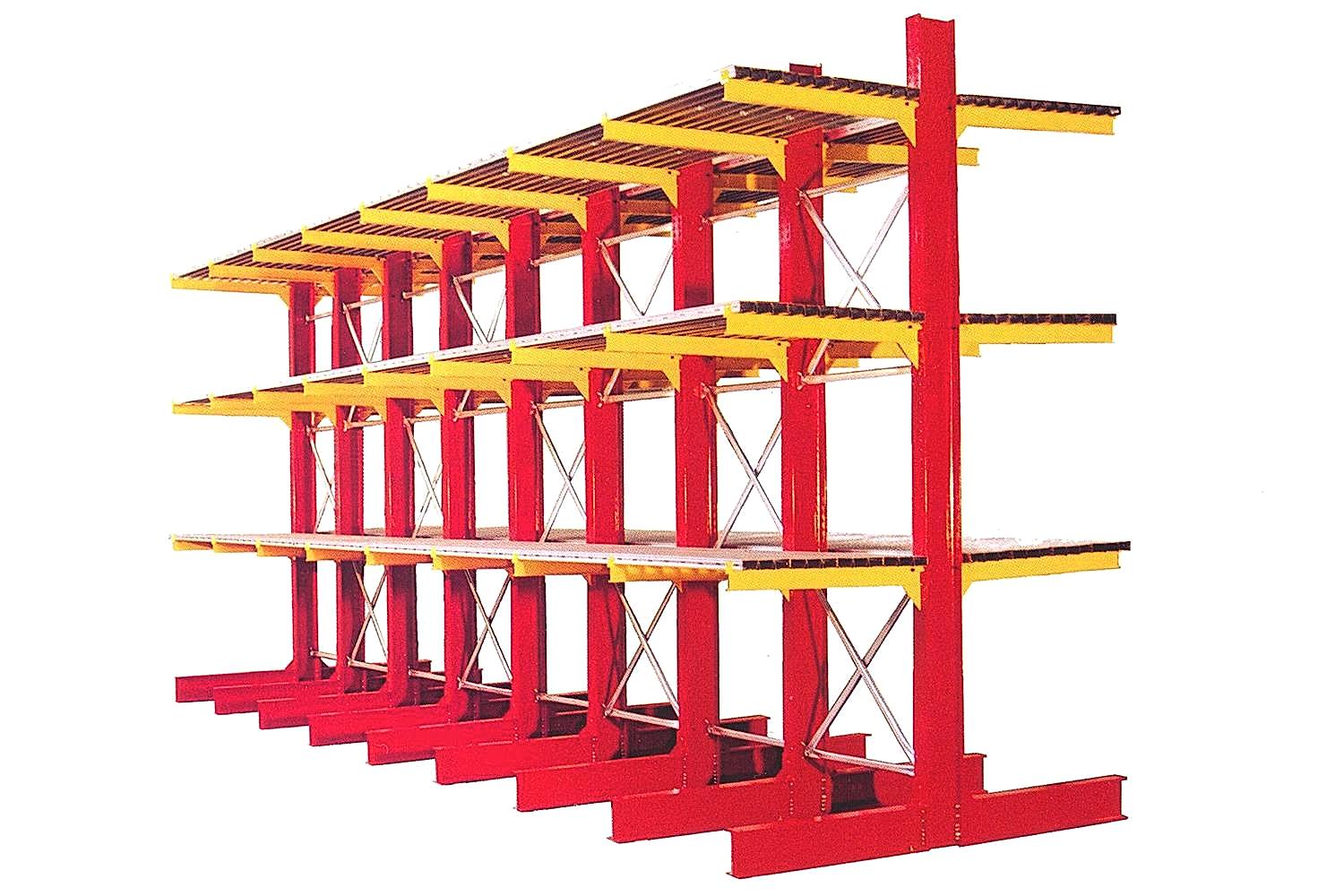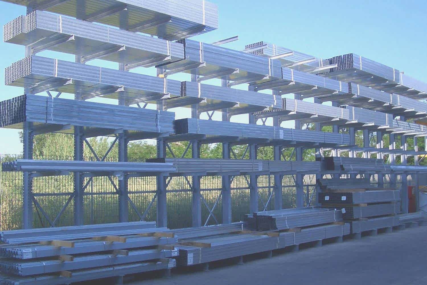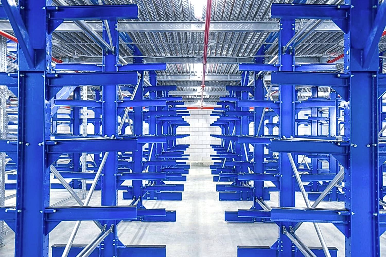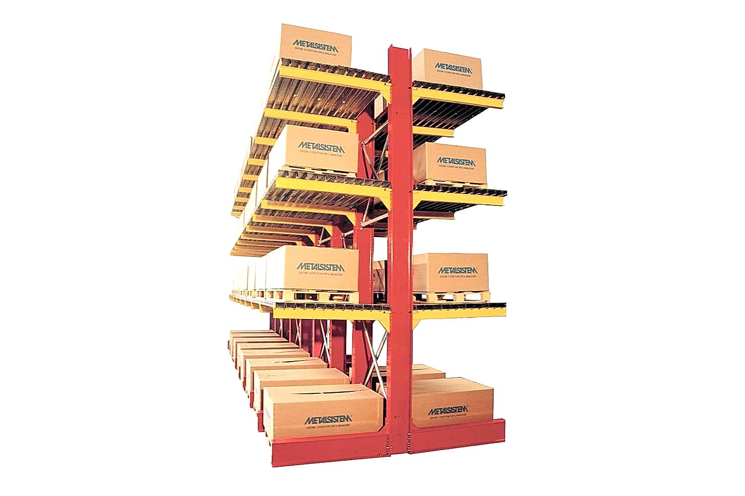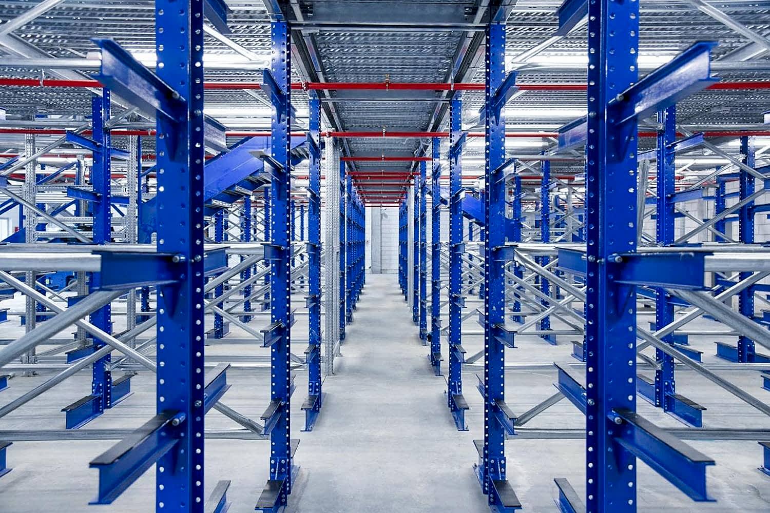 Konsol kollu raf sistemi, farklı ve değişken uzunluktaki ürünlerin nizami olarak depolanması için kullanılır.